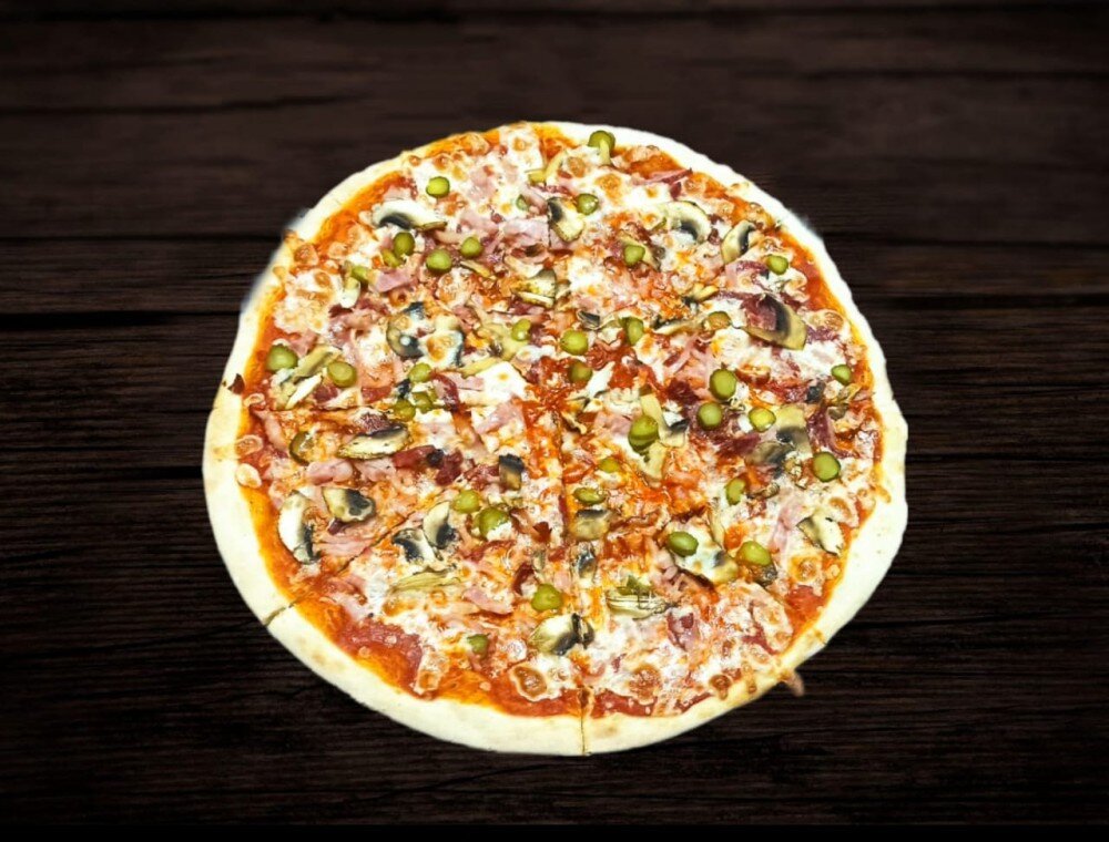 Это большая пицца по стремительно выгодной цене. мы делаем ее из гастрономии, что не сгодилась на "Красивую" нарезку для других пицц. короче, пицца, как пицца, просто не из филе. Грибы, сыр и огурчики. 32 см