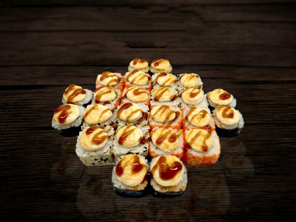 Ролл «Нежный с курицей », ролл «Запеченный с лососем», ролл «Запеченный с креветкой»
