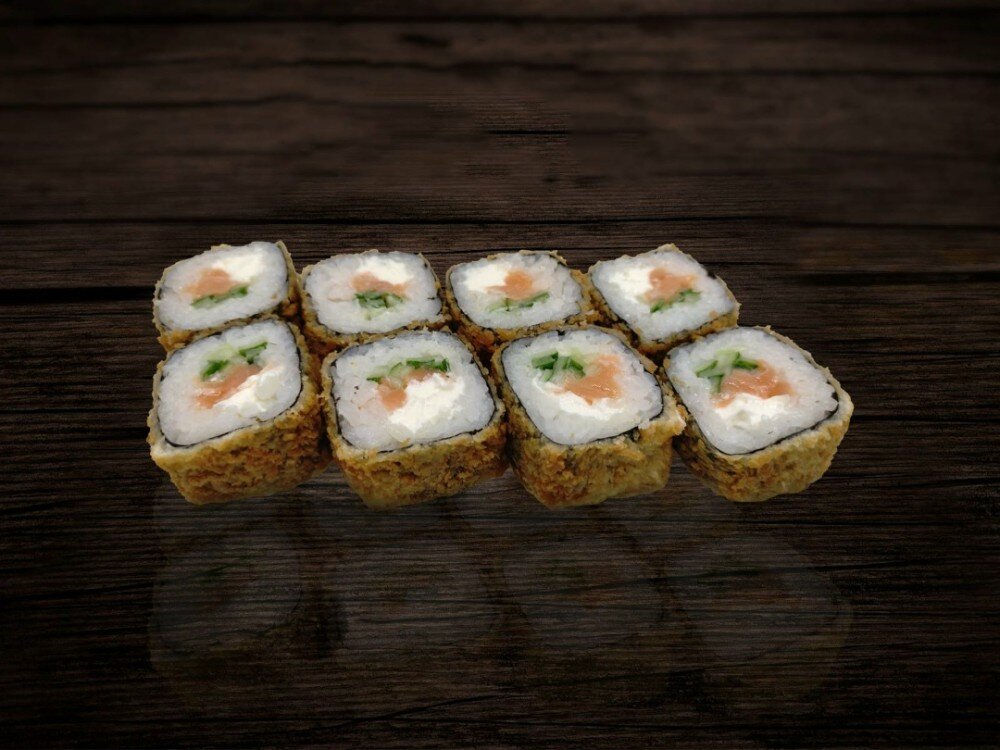 Рис, нори, лосось, огурец, сыр сливочный, темпура